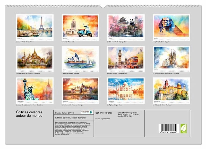 Chaque page de ce calendrier est une invitation à contempler des merveilles architecturales emblématiques. Laissez ces illustrations éveiller votre imagination et vous transporter dans des lieux légendaires empreints d'histoire et de grandeur. Ce calendrier vous transportera vers des horizons lointains et ravivera votre passion pour les voyages et la beauté artistique. Il ajoutera une touche d'art et d'élégance à votre quotidien et illuminera votre espace de vie.
