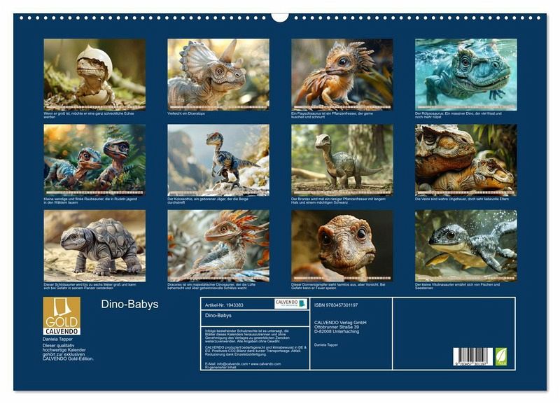 Mit Hilfe einer KI können wir einen kleinen Blick in die Urzeit wagen. Und wer liebt nicht Baby-Dinosaurier? Sie sind süß, knuffig und manchmal auch ein bisschen gefährlich. Aber keine Sorge, mit unserem Kalender zum Thema "Dino-Babys" können Sie jeden Monat ein neues Bild von diesen urzeitlichen Wundern bestaunen, ohne Angst haben zu müssen, dass sie Ihnen an den Kragen gehen! Dieser qualitativ hochwertige Kalender gehört zur exklusiven CALVENDO Gold-Edition.