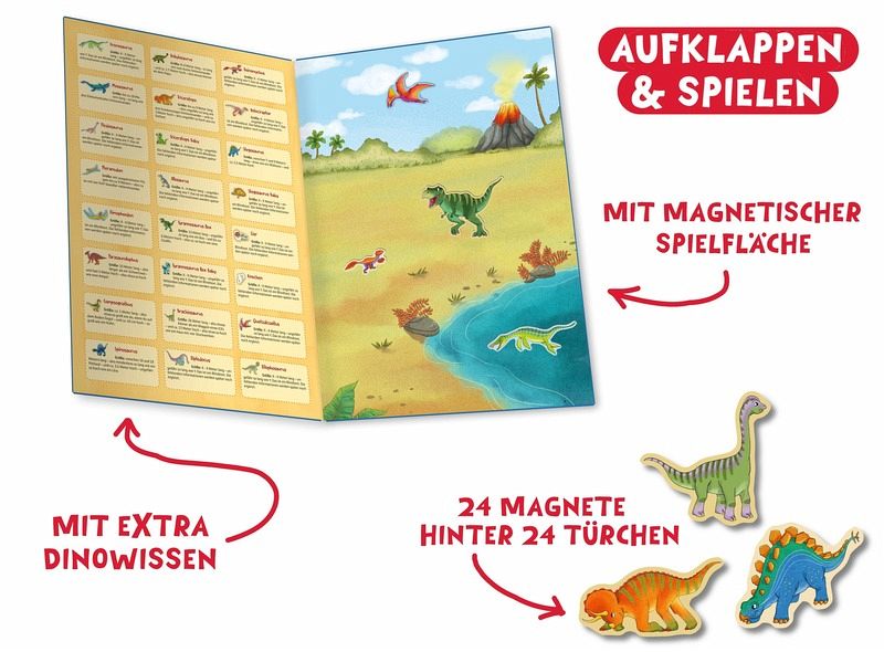- Täglich eines der Türchen auf der Vorderseite des Adventskalenders öffnen und einen von 24 Dino-Magneten entdecken