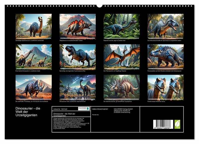 Hier kommen alle Dino-Fans voll auf ihre Kosten. Lass dich entführen in eine Ära vor Millionen von Jahren, als die Erde noch von majestätischen Kreaturen beherrscht wurde, die heute nur noch als Fossilien existieren. Wie haben diese Urzeittiere wohl wirklich ausgesehen, in welcher Natur lebten sie? Der mithilfe von KI und viel Fantasie erstellte Kalender von Renate Utz ermöglicht uns interessante Einblicke in diese vergangene Erdgeschichte. Lass dich von der Magie und den Geheimnissen dieser längst vergangenen Ära verzaubern und bringe ein Stück dieser faszinierenden Zeitgeschichte in dein Zuhause. Ob für Kinder oder Dinosaurier-Enthusiasten, dieser außergewöhnliche Dino-Kalender ist das ideale Geschenk für jeden, der sich für die Welt der Dinosaurier oder Flugsaurier begeistert.