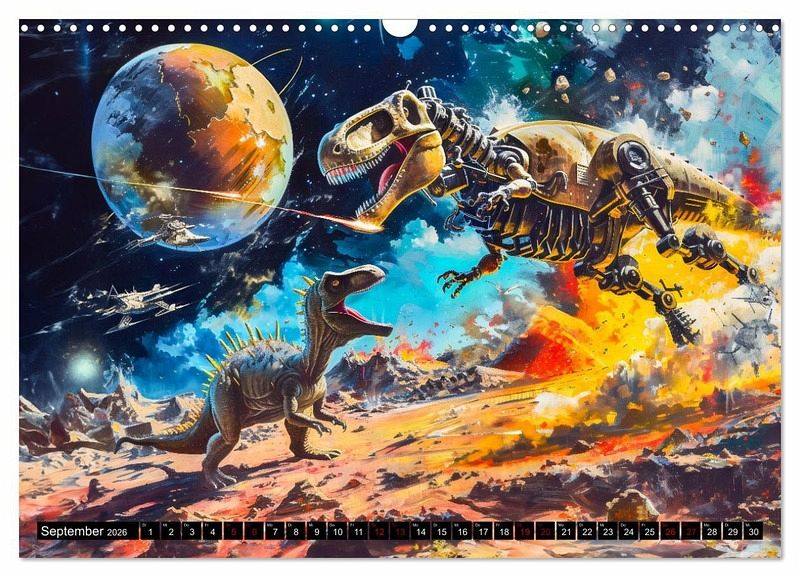 Entdecken Sie mit unserem Kalender "Dinosaurier Sci-Fi - Kampf der Urzeitgiganten im Weltall" eine epische Saga aus einer fernen Vergangenheit. Tauchen Sie ein in eine Welt voller Science-Fiction und Fantasy, in der die majestätischen Dinosaurier gegen furchterregende Aliens im unendlichen Weltraum kämpfen. Jeder Monat präsentiert atemberaubende KI-generierte Illustrationen, die sowohl Science-Fiction-Fans als auch Liebhaber der prähistorischen Ära begeistern werden. Erleben Sie den Zusammenprall zweier Welten, eingefangen in kunstvollen Bildern, die die grenzenlose Fantasie der Menschheit feiern. Ideal für alle, die sich für Dinosaurier, Science-Fiction und epische Abenteuer begeistern!