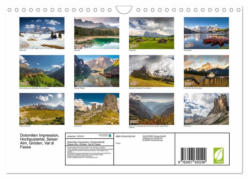 Dieser Kalender wird alle Naturliebhaber und Reiseenthusiasten begeistern. Der Kalender zeigt einige der Highlights der Dolomiten, wie die Seiser Alm, den Pragser Wildsee, die drei Zinnen, der Secada, den Karersee, etc. Er eignet sich natürlich als Geschenk für alle Berg- und Naturliebhaber.