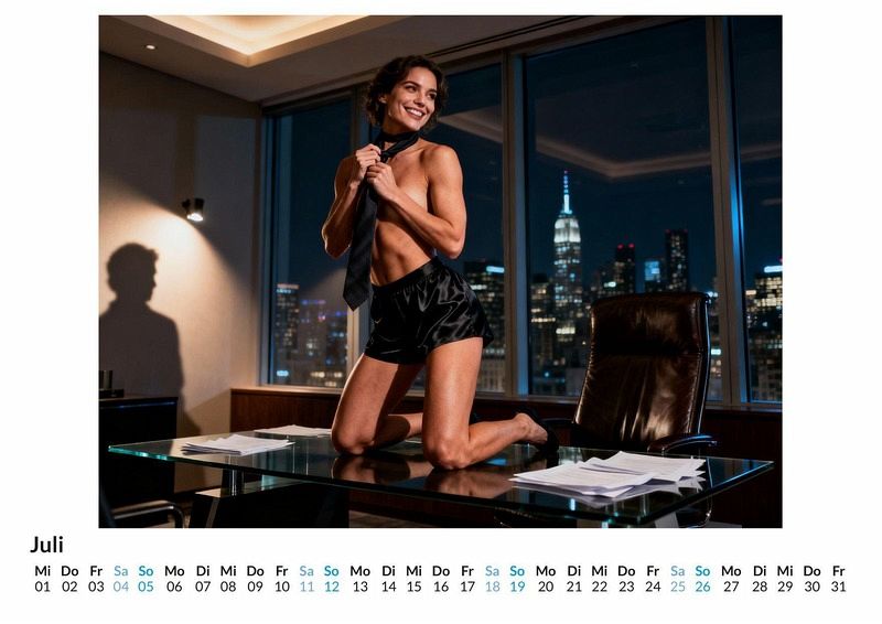 Wenn die Lichter im Büro erlöschen und die Akten des Tages geschlossen sind, beginnt eine andere Zeit. Der Kalender "Dominante Managerinnen" fängt jene Momente ein, in denen Macht und Sinnlichkeit eine faszinierende Verbindung eingehen. Er zeigt eine Facette der Führungsebene, die sonst im Verborgenen bleibt. Dieser Kalender ist eine passende Wahl: * Für Liebhaber von Fotografien, die Stärke und Ästhetik verbinden. * Für Menschen, die einen Wandschmuck abseits des Gewöhnlichen suchen. * Für Sammler von thematischen Kalendern mit einem provokanten Ansatz. Jeder Monat präsentiert eine neue Szene aus dem Leben einer erfolgreichen Frau, die ihre dominante Seite auch nach Feierabend auslebt. Ob im Negligé am Schreibtisch, mit den High Heels selbstbewusst auf dem Konferenztisch platziert oder in einem Moment der entspannten Überlegenheit im Chefsessel. Diese Szenen, durch die Kraft fortschrittlicher Algorithmen zum Leben erweckt, spielen gezielt mit den Klischees von Autorität und Verführung. Die Kompositionen zeigen selbstbewusste Frauen in Posen der Kontrolle und Stärke, eingefangen in einer Atmosphäre, die zwischen professioneller Kühle und persönlicher Entfaltung pendelt. Der Kalender bietet: * Zwölf Monatsmotive und ein Deckblatt im einheitlichen Stil. * Ein praktisches Kalendarium für die Organisation von Terminen. * Großformatige Darstellungen für eine präsente Wirkung an der Wand. Zusammenfassend ist dieser Kalender eine Hommage an die vielschichtige Natur von Macht und Weiblichkeit. Er bricht bewusst mit Konventionen und bietet eine neue, kühne Perspektive auf das Bild der modernen Führungskraft. Jedes Blatt ist eine Einladung, die Grenzen zwischen Business und privater Souveränität neu zu betrachten. Entdecken Sie die zwölf Kompositionen, die das kommende Jahr begleiten werden.