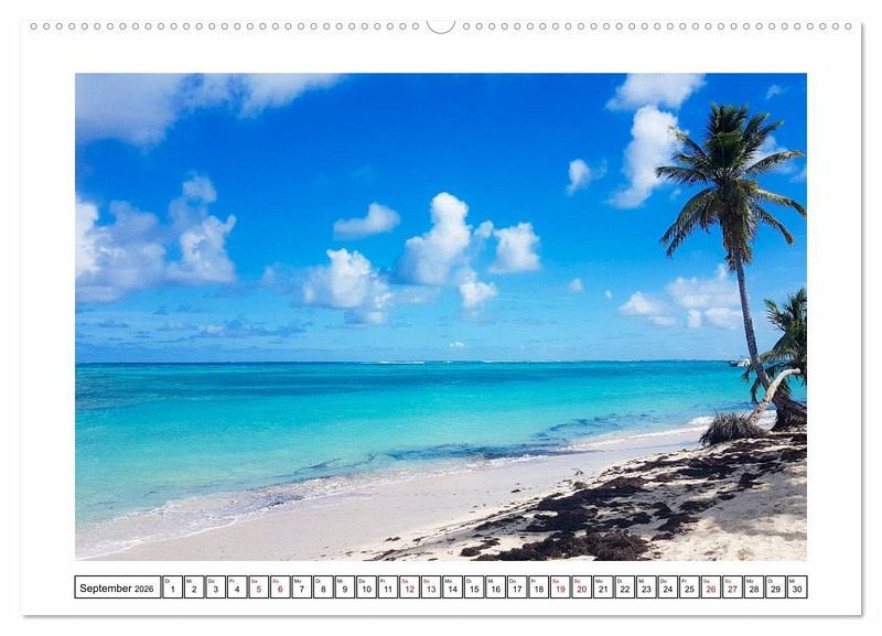 Dieser Kalender zeigt alle Fasetten der Karibikinsel: wunderschöne Palmen und Sandstrände, die berühmete Barcadi Insel und auch das Inland mit Wäldern und deren Tieren. Die Dominikanische Republik ist ein Karibikstaat auf der Insel Hispaniola, deren westlicher Teil von Haiti eingenommen wird. Das Land ist bekannt für seine wunderschönen Strände, Urlaubsorte und Golfplätze. Das Landschaftsbild reicht von Regenwäldern über Savannen bis zum Hochland mit dem Pico Duarte, dem höchsten Berg der Karibik, der 3000 Hm misst. Zu den Wahrzeichen der Hauptstadt Santo Domingo zählt die 500 Jahre alte gotische Catedral Primada de America im spanischen Kolonialviertel Zona.Die Dominikanische Republik ist ein Karibikstaat auf der Insel Hispaniola, deren westlicher Teil von Haiti eingenommen wird.