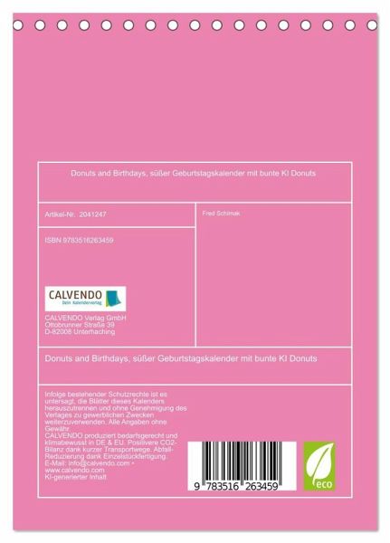 QUALITÄT - Hochwertiger Fotokalender mit 12 wunderschönen Motiven auf lichtbeständigem Bilderdruckpapier, robuste Spiralbindung.NACHHALTIG - deutliche Abfallreduzierung durch bedarfsgerechte Einzelstückfertigung, umweltfreundliches FSC-zertifiziertes Papier, Produktion in Deutschland, klimabewusste Logistik.PERFEKTES GESCHENK - Kalender für Freunde und Familie, für Kinder und Erwachsene, jung und alt, zu Weihnachten, Geburtstag oder zwischendurch.VIELFALT - Bildkalender in verschiedenen Formaten, z.B. DIN A5, DIN A4, DIN A3 sowie DIN A2. Ob Naturmotiv, Gemälde oder Fotos, ideal für ein persönliches Wohlfühlambiente.Süße Geburtstage. Ein Jahr voller bunter Donuts. von Autor(in): Michaela Spreider