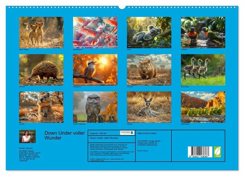 PREMIUM-LINIE - Brillanter Fotokalender mit 12 wunderschönen Motiven, Kunstdruck in Hochglanz in Museumsqualität.QUALITÄT - edle Materialien, stabile Rückwand mit 2 innovativen Einstecktaschen für eine optimale Präsentation an der Wand.NACHHALTIG - deutliche Abfallreduzierung durch bedarfsgerechte Einzelstückfertigung, umweltfreundliches FSC-zertifiziertes Papier, Produktion in Deutschland, klimabewusste Logistik.PERFEKTES GESCHENK - Kalender für Freunde und Familie, für Kinder und Erwachsene, jung und alt, zu Weihnachten, Geburtstag oder zwischendurch.Australiens Tierreich: Ein Jahr in KI generierten Bildern von Autor(in): Kerstin Waurick