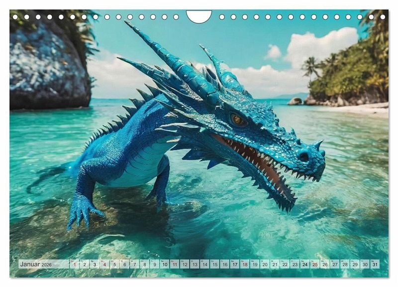 Januar: Ein blauer Wasserdrachen durchstreift sein Inselreich