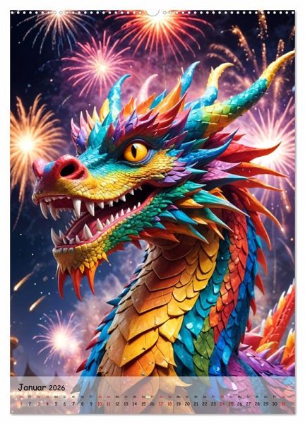Januar: Ein festlicher und strahlender Drache, der den Beginn des Jahres mit seiner Leuchtkraft und seinem farbenfrohen Feuerwerk feiert.