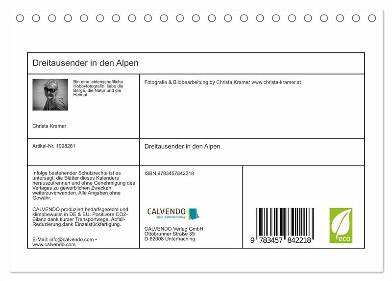 QUALITÄT - Hochwertiger Fotokalender mit 12 wunderschönen Motiven auf lichtbeständigem Bilderdruckpapier, robuste Spiralbindung.NACHHALTIG - deutliche Abfallreduzierung durch bedarfsgerechte Einzelstückfertigung, umweltfreundliches FSC-zertifiziertes Papier, Produktion in Deutschland, klimabewusste Logistik.PERFEKTES GESCHENK - Kalender für Freunde und Familie, für Kinder und Erwachsene, jung und alt, zu Weihnachten, Geburtstag oder zwischendurch.VIELFALT - Bildkalender in verschiedenen Formaten, z.B. DIN A5, DIN A4, DIN A3 sowie DIN A2. Ob Naturmotiv, Gemälde oder Fotos, ideal für ein persönliches Wohlfühlambiente.Die höchsten Berge Österreichs in schwarz weiß von Autor(in): Christa Kramer