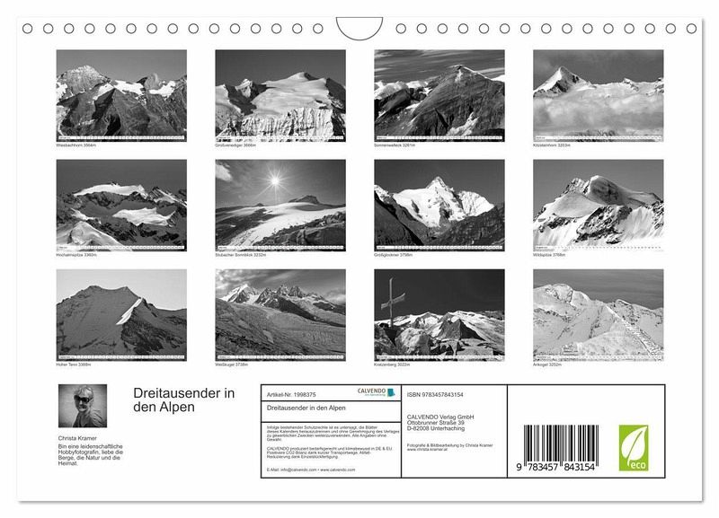 QUALITÄT - Hochwertiger Fotokalender mit 12 wunderschönen Motiven auf lichtbeständigem Bilderdruckpapier, robuste Spiralbindung mit Aufhängebügel.NACHHALTIG - deutliche Abfallreduzierung durch bedarfsgerechte Einzelstückfertigung, umweltfreundliches FSC-zertifiziertes Papier, Produktion in Deutschland, klimabewusste Logistik.PERFEKTES GESCHENK - Kalender für Freunde und Familie, für Kinder und Erwachsene, jung und alt, zu Weihnachten, Geburtstag oder zwischendurch.VIELFALT - Bildkalender in verschiedenen Formaten, z.B. DIN A5, DIN A4, DIN A3 sowie DIN A2. Ob Naturmotiv, Gemälde oder Fotos, ideal für ein persönliches Wohlfühlambiente.Die höchsten Berge Österreichs in schwarz weiß von Autor(in): Christa Kramer
