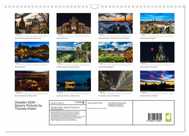 QUALITÄT - Hochwertiger Fotokalender mit 12 wunderschönen Motiven auf lichtbeständigem Bilderdruckpapier, robuste Spiralbindung mit Aufhängebügel.NACHHALTIG - deutliche Abfallreduzierung durch bedarfsgerechte Einzelstückfertigung, umweltfreundliches FSC-zertifiziertes Papier, Produktion in Deutschland, klimabewusste Logistik.PERFEKTES GESCHENK - Kalender für Freunde und Familie, für Kinder und Erwachsene, jung und alt, zu Weihnachten, Geburtstag oder zwischendurch.VIELFALT - Bildkalender in verschiedenen Formaten, z.B. DIN A5, DIN A4, DIN A3 sowie DIN A2. Ob Naturmotiv, Gemälde oder Fotos, ideal für ein persönliches Wohlfühlambiente.Fotos aus Dresden und Umgebung von Autor(in): Thomas Kriehn