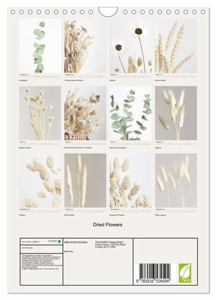 QUALITY - High-quality photo calendar with 12 beautiful images on light-resistant paper, robust spiral binding with hanger.SUSTAINABLE - Significant waste reduction due to print-on-demand production, environmentally friendly FSC-certified paper, produced in the UK, climate-conscious logistical processes.PERFECT GIFT - calendars for friends and family, for children, all ages and all occasions, from Christmas to birthdays and everything in between.LOTS OF CHOICE - Wall calendars in different sizes (DIN A4 and DIN A3), for any topic and personal taste, featuring photography, painting and illustrations.Beautiful Photography of dried flowers, author: Maria Iliev