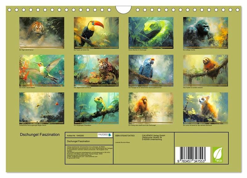 QUALITÄT - Hochwertiger Fotokalender mit 12 wunderschönen Motiven auf lichtbeständigem Bilderdruckpapier, robuste Spiralbindung mit Aufhängebügel.NACHHALTIG - deutliche Abfallreduzierung durch bedarfsgerechte Einzelstückfertigung, umweltfreundliches FSC-zertifiziertes Papier, Produktion in Deutschland, klimabewusste Logistik.PERFEKTES GESCHENK - Kalender für Freunde und Familie, für Kinder und Erwachsene, jung und alt, zu Weihnachten, Geburtstag oder zwischendurch.VIELFALT - Bildkalender in verschiedenen Formaten, z.B. DIN A5, DIN A4, DIN A3 sowie DIN A2. Ob Naturmotiv, Gemälde oder Fotos, ideal für ein persönliches Wohlfühlambiente.Dschungeltiere in kunstvollen Bildern von Autor(in): Liselotte Brunner-Klaus