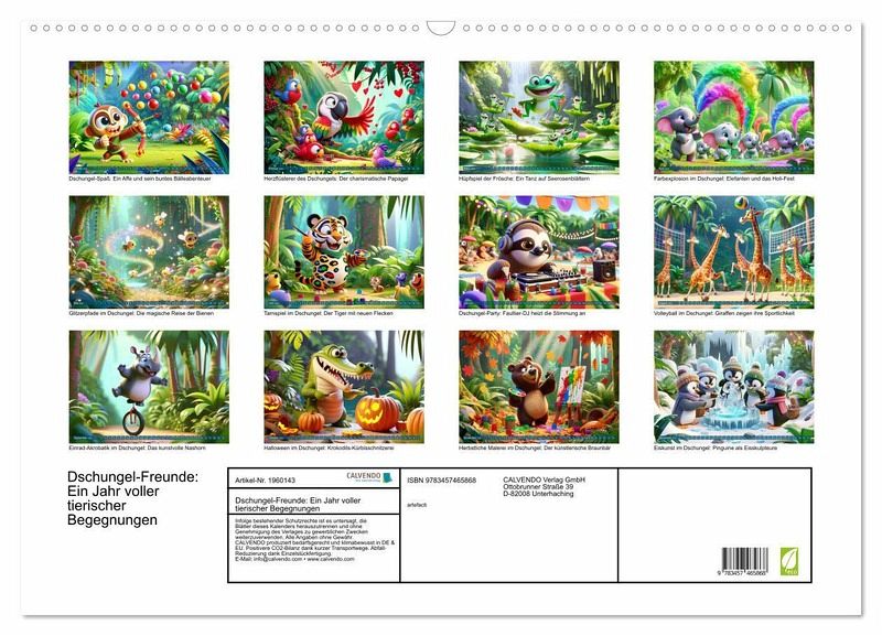 Entdecken Sie 'Dschungel-Freunde: Ein Jahr voller tierischer Begegnungen'! Dieser einzigartige Kalender, erschaffen mit der Kraft künstlicher Intelligenz, nimmt Sie mit auf eine Reise durch den Dschungel. Jeden Monat erwarten Sie neue, farbenfrohe und lebendige Motive unserer tierischen Freunde. Perfekt für Naturliebhaber und Fans phantasievoller Kunst. Lassen Sie sich von der Vielfalt und Kreativität des Dschungels verzaubern!
