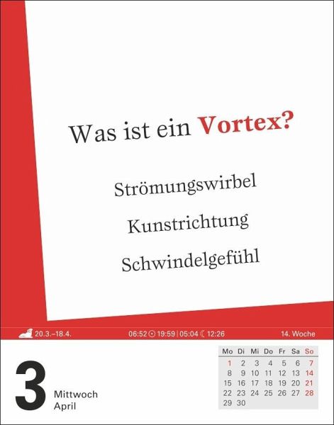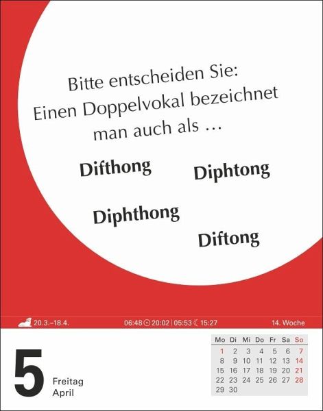 Raus mit der Sprache!Groß, klein, getrennt, zusammen? Wieso ist im Sprichwort ausgerechnet Schmalhans Küchenmeister? Was verstehen Sie unter Prosodie? Vor welche Bindewörter gehört ein Komma, vor welche nicht? Eine spannende Reise durch unsere Sprache:- Rechtschreibregeln und Stolperfallen- Tipps zu Stilfragen und Sprachgebrauch- Abwechslungsreiche Übungen- Herkunft von Redewendungen und vergessene WortschätzeJeder Wochentag ein Kalenderblatt, Samstag/Sonntag auf einem Blatt