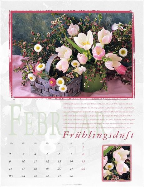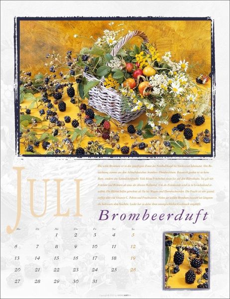 - Ein Fest der Sinne: farbenprächtige Blumen-, Kräuter- und Früchtearrangements der bekannten Fotografin Rita Bellmann- Monatskalender mit zarten Aromen, die sich beim Reiben über den Duftspot entfalten- Verschwenderische Blüten-Pracht trifft auf duftende Früchte: Fotokalender mit brillanten Farben und dem besonderen Lifestyle-Extra- Ein bunter Alltagsbegleiter im 30 x 39 cm Hochformat, der überall Platz findet- Vielfalt, die begeistert: die Jahres-Wandkalender von Weingarten im Athesia Kalenderverlag