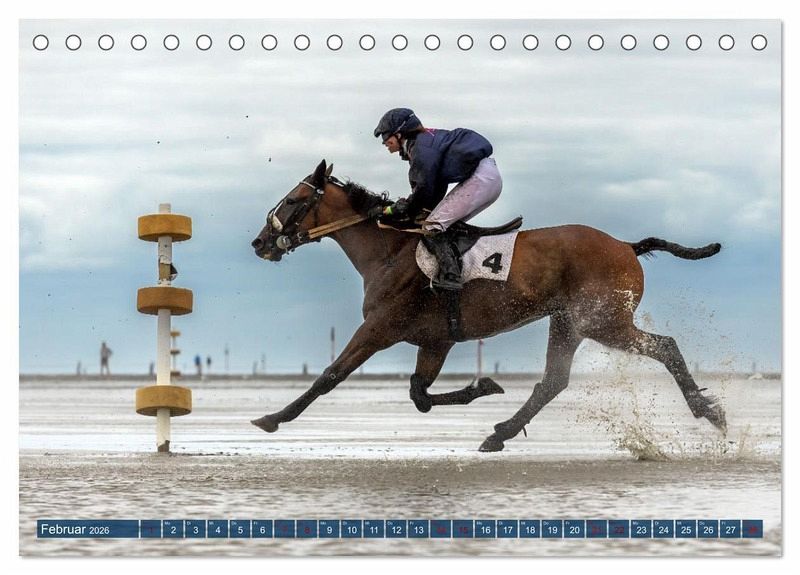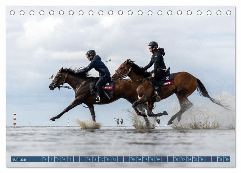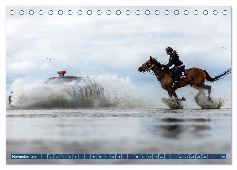 Die spektakuläre Dynamik dieses Pferderennens wird in diesem Kalender auf ganz vielfältige Weise zum Ausdruck gebracht. So präsentiert die Fotografin hier sowohl Aufnahmen mit sehr kurzen Belichtungszeiten, in denen das aufspritzende Wasser wie eingefroren wirkt, als auch Fotos mit längeren Belichtungszeiten, die als Mitzieher bzw. kreative Fototechnik die schnelle Bewegung besonders hervorheben.