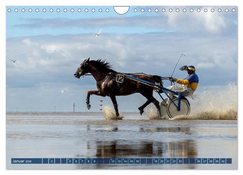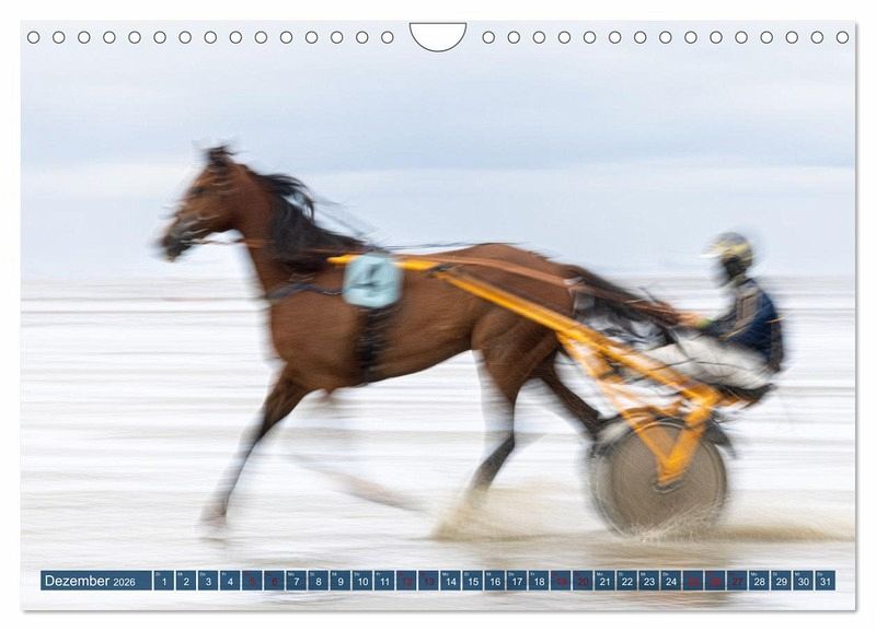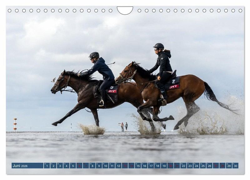 Die spektakuläre Dynamik dieses Pferderennens wird in diesem Kalender auf ganz vielfältige Weise zum Ausdruck gebracht. So präsentiert die Fotografin hier sowohl Aufnahmen mit sehr kurzen Belichtungszeiten, in denen das aufspritzende Wasser wie eingefroren wirkt, als auch Fotos mit längeren Belichtungszeiten, die als Mitzieher bzw. kreative Fototechnik die schnelle Bewegung besonders hervorheben.