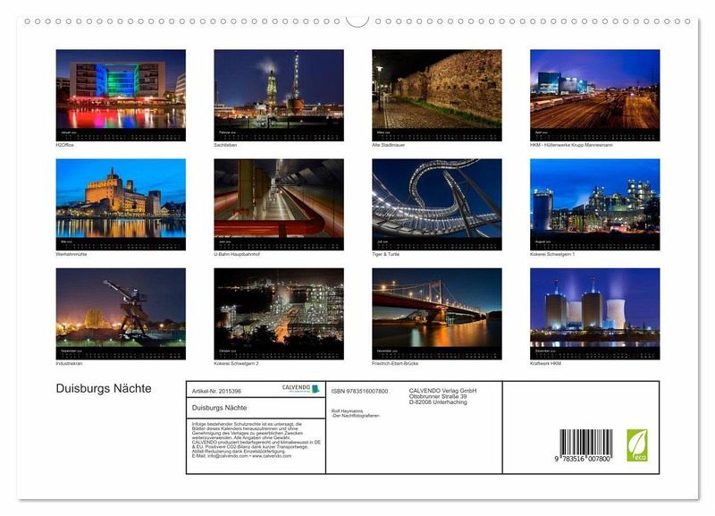 PREMIUM-LINIE - Brillanter Fotokalender mit 12 wunderschönen Motiven, Kunstdruck in Hochglanz in Museumsqualität.QUALITÄT - edle Materialien, stabile Rückwand mit 2 innovativen Einstecktaschen für eine optimale Präsentation an der Wand.NACHHALTIG - deutliche Abfallreduzierung durch bedarfsgerechte Einzelstückfertigung, umweltfreundliches FSC-zertifiziertes Papier, Produktion in Deutschland, klimabewusste Logistik.PERFEKTES GESCHENK - Kalender für Freunde und Familie, für Kinder und Erwachsene, jung und alt, zu Weihnachten, Geburtstag oder zwischendurch.Nachtfotos aus Duisburg, Stadt und Industrie von Autor(in): Rolf Heymanns