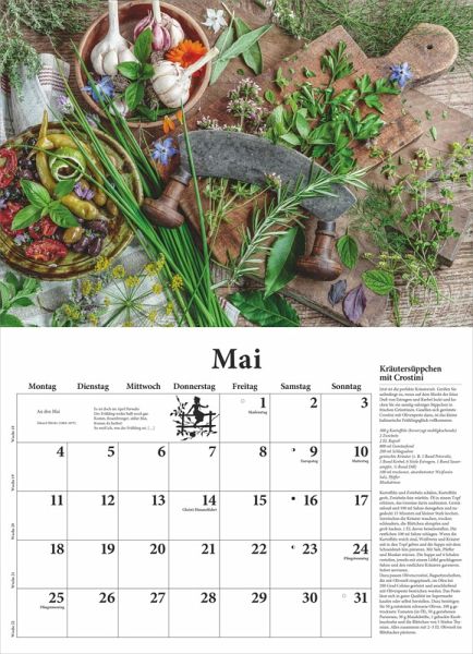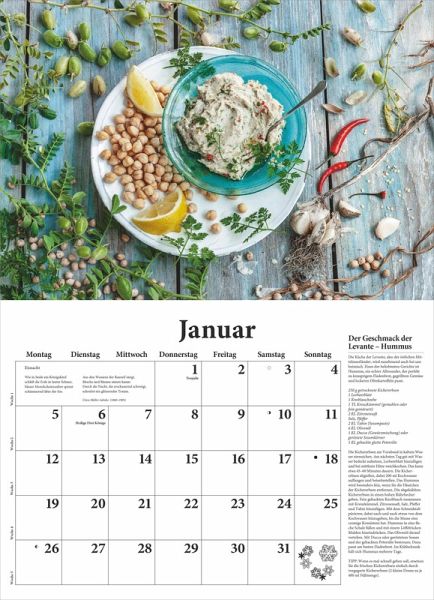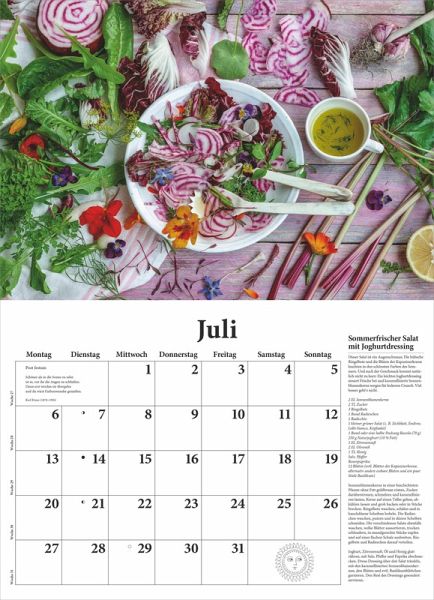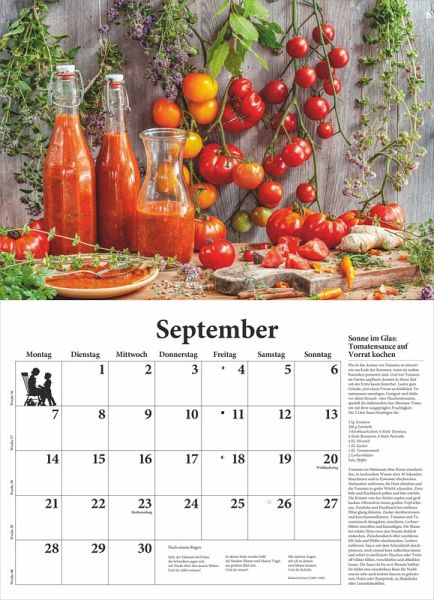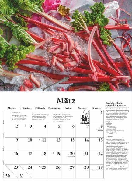 Die einzigartigen Food-Fotografien von Christel Rosenfeld in Kombination mit sorgfältig erprobten Rezepten machen ihn unnachahmlich und jedes Jahr aufs Neue zum Bestseller. Die reizenden Schmuckvignetten und jahreszeitlichen Gedichten auf jedem Kalenderblatt tun ihr Übriges, damit dieser Broschürenkalender, geöffnet ist er 42 x 58 cm groß, zum Blickfang in der Küche wird und viel praktischen Nutzen bietet.