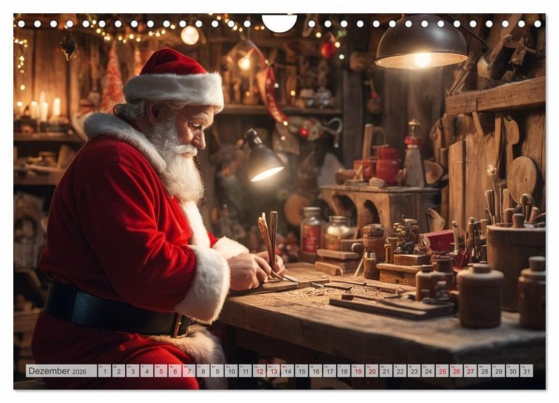Dezember: Der Weihnachtsmann in der Werkstatt.