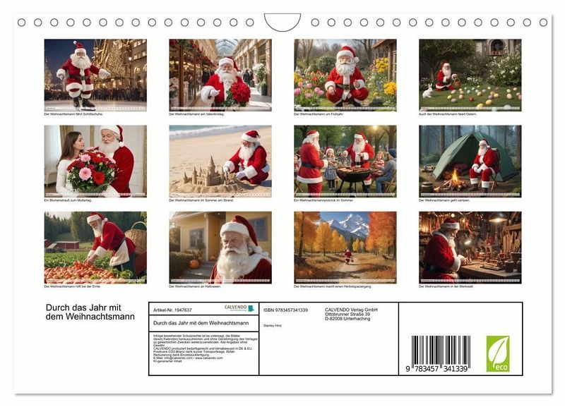 Tauchen Sie ein in das Wunder des Jahres mit unserem bezaubernden "Durch das Jahr mit dem Weihnachtsmann" Wandkalender! Jeder Monat enthüllt eine charmante Illustration des gutmütigen Weihnachtsmanns, der saisonale Ereignisse und Traditionen auf lebendige Weise zum Leben erweckt.