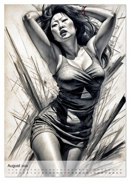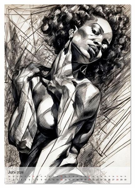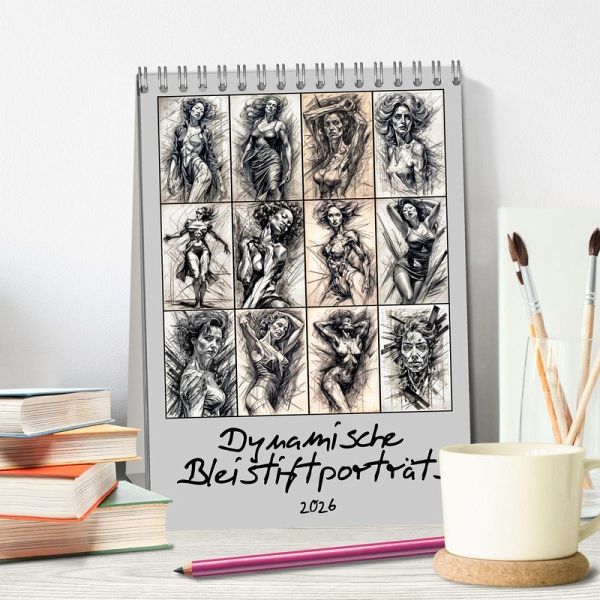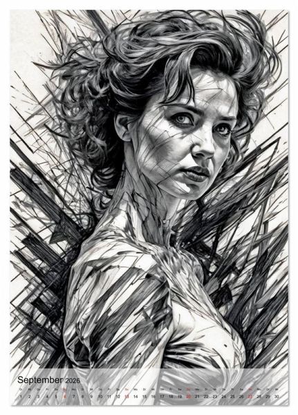 Mit Unterstützung von künstlicher Intelligenz ist dieser Kalender entstanden, der weibliche Figuren meist in dynamischen Posen in Bleistiftstudien darstellt. Das kann sowohl die Körperbewegung betreffen, als auch eine innere, emotionale Bewegung. Die Dynamik ist zusätzlich hervorgehoben durch eine sehr kraftvolle, fast wilde Strichführung, die sich nicht auf die Begrenzungen der Figur beschränkt. Diese Art, Bewegung und Dynamik im Bild darzustellen, erinnert vielfach an Arbeiten italienischer Futuristen, vor allem an Bilder von Umberto Bocchioni, auch wenn Motive und Technik andere sind.