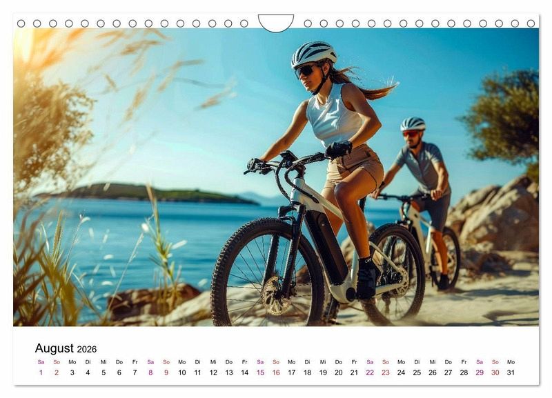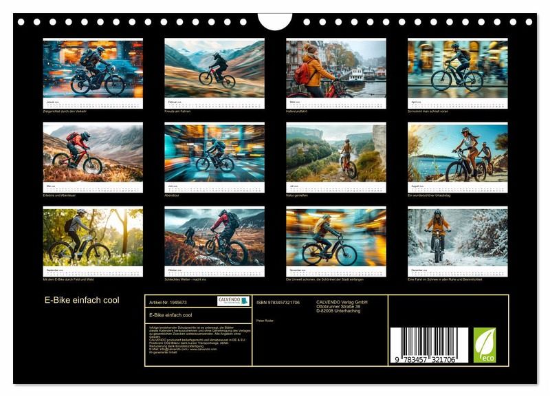 Erleben Sie die Freude am Radfahren mit diesem E-Bike-Kalender. Lassen Sie folgende Szenen auf sich einwirken: E-Bike-Fahrer, die sich mit Leichtigkeit und Stil durch die belebten Straßen der Stadt bewegen oder E-Biker, die steile Aufstiege und berauschende Abfahrten bewältigen und ebenso die Ruhe des E-Bike-Fahrens auf malerischen Landwegen, an ruhigen Seen und an Küstenrouten. Der Fotokünstler Peter Roder hat fantastische KI-Bilder gestaltet und zusammengestellt. Perfekt für E-Bike-Enthusiasten, Abenteurer und alle, die einen aufregenden, umweltfreundlichen Lebensstil suchen.