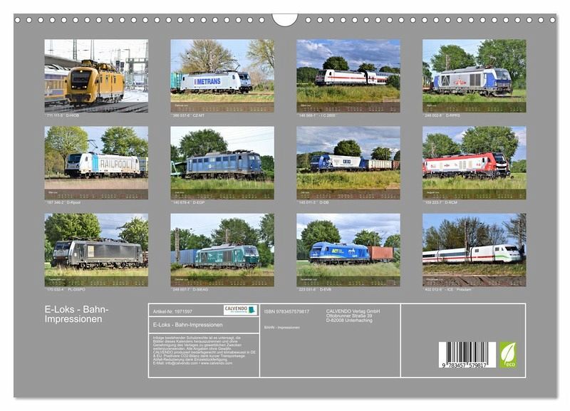 Dieser Kalender bietet eine Auswahl von Elektro-Lokomotiven (E:Lok`s). Zwischen Bremen und Hannover befindet sich ein Mekka für Eisenbahn-Romantiker wie dem Fotografen -Günther Klünder-. Steigen sie ein und begleiten sie mich auf diese faszinierende Reise durch die Eisenbahnromantik. Das ideale Geschenk für alle Trainspotter und jeden Eisenbahn-Liebhaber !