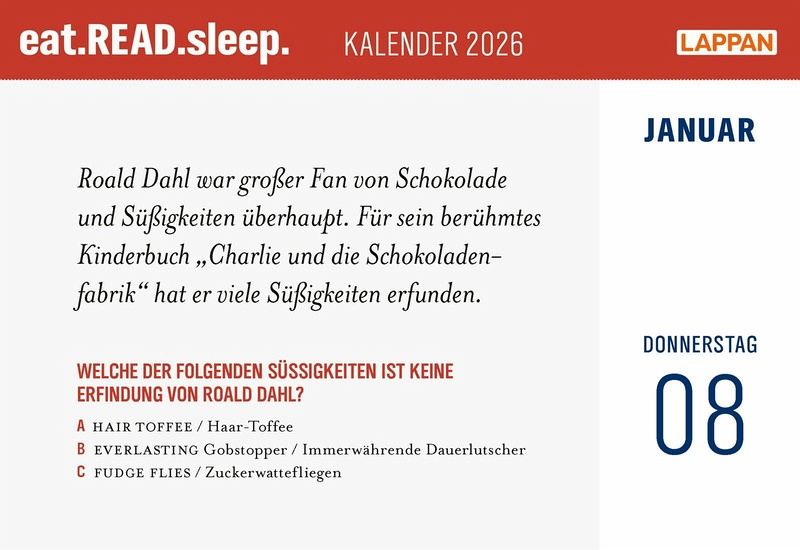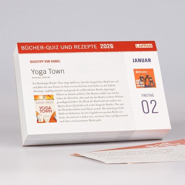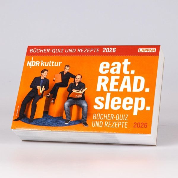 Tägliche Highlights: Spannende Quizfragen und Fun Facts rund um Bücher und ihre Autor_innenLeseinspiration: Buchtipps, präsentiert von Daniel, Jan oder Katharina.Kulinarischer Genuss: Jede Menge Rezepte aus dem Podcast eat.READ.sleep.Tageskalender mit 320 perforierten Blättern und praktischer Aufstellvorrichtung.