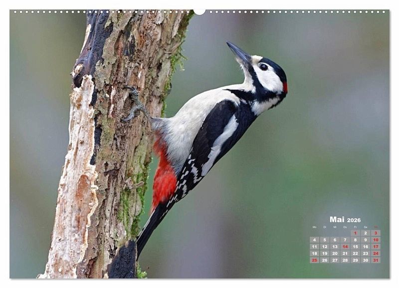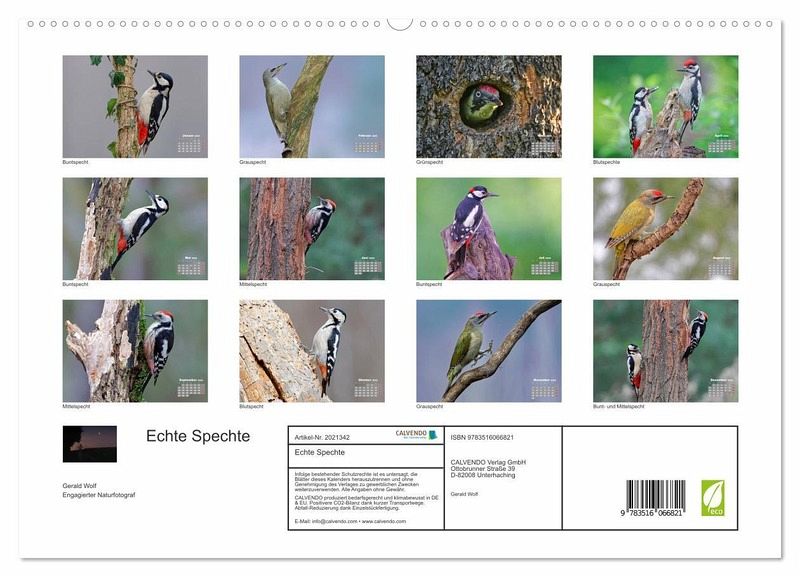 Dieser Kalender zeigt hochwertige Aufnahmen bekannter und weniger bekannter europäischer Spechtarten - gezeigt werden Buntspecht, Blutspecht, Grauspecht, Mittelspecht und Grünspecht.
