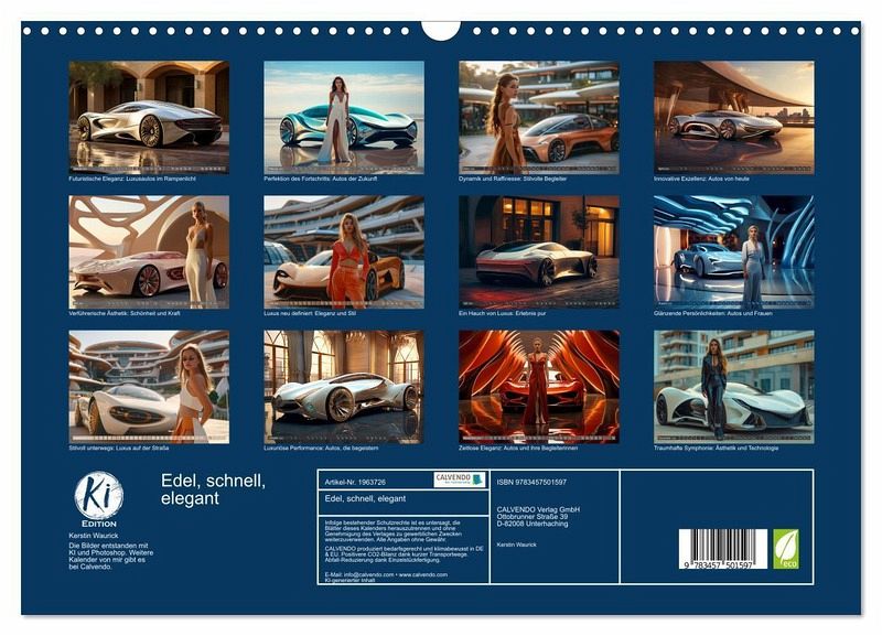Dieser Kalender präsentiert eine faszinierende Fusion aus eleganten Autos in organischen Formen, kombiniert mit schönen Frauen und selbstbewussten Männern. Jeder Monat wird zu einem einzigartigen Kunstwerk zum träumen, das die Faszination für moderne Automobiltechnik und die Eleganz weiblicher Schönheit in einer harmonischen Komposition vereint. Genießen Sie die Ideen, die die künstliche Intelligenz eingebracht hat, zu zeigen, wie sie sich edle Fahrzeuge vorstellt.