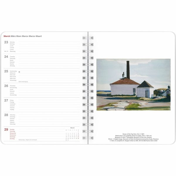 Buchkalender im Format 17 x 22 cm großzügig & praktischEine Woche auf einen Blick für klare Terminübersicht6-sprachiges Kalendarium (DE/EN/FR/IT/ES/NL) mit internationalen FeiertagenMit Mondphasen, Jahresübersicht & Monatsübersichten12 Bildseiten mit Meisterwerken Edward HoppersDeluxe-Ausstattung: stabiles Plastikcover, Spiralbindung, perforierte Notizzettel, herausnehmbarer HalbjahresplanerPraktisch für Beruf, Schule, Studium & private PlanungPerfektes Geschenk für Hopper-Fans & Liebhaber realistischer Kunst