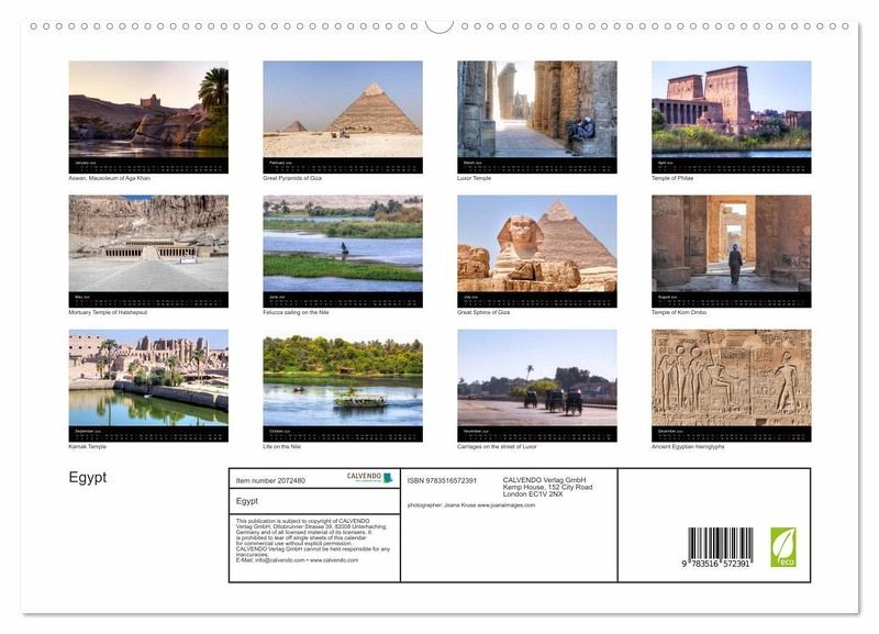 PREMIUM COLLECTION - Brilliant photo calendar with 12 beautiful motifs, high-gloss art print in museum quality.QUALITY - high-quality materials, sturdy back cover with 2 innovative insert pockets for optimum presentation on the wall.SUSTAINABLE - significant reduction in waste thanks to customised one-off production, environmentally friendly FSC-certified paper, production in Germany, climate-conscious logistics.PERFECT GIFT - calendars for friends and family, for children and adults, young and old, for Christmas, birthdays or in between.Country of deserts and temples von Autor(in): Joana Kruse