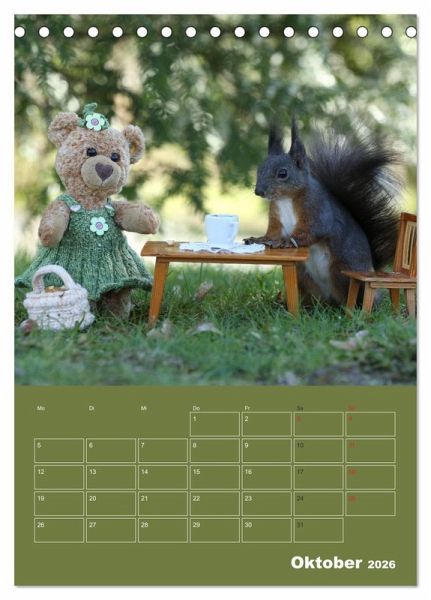 September: Teddy und Eichhörnchen trinken zusammen Kaffee.