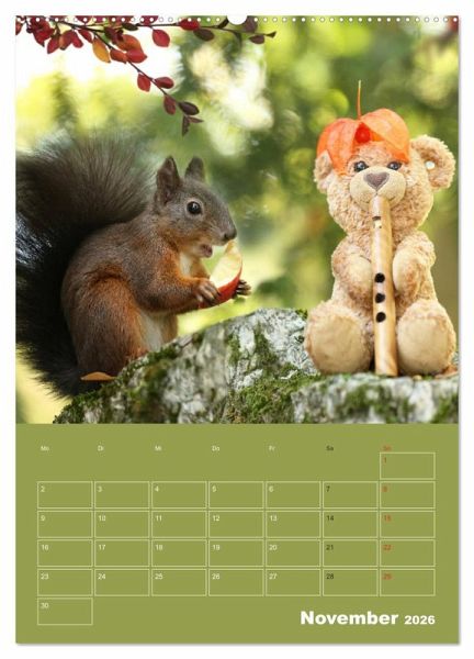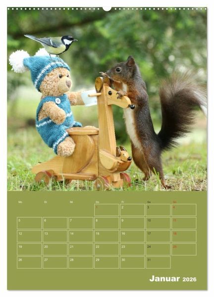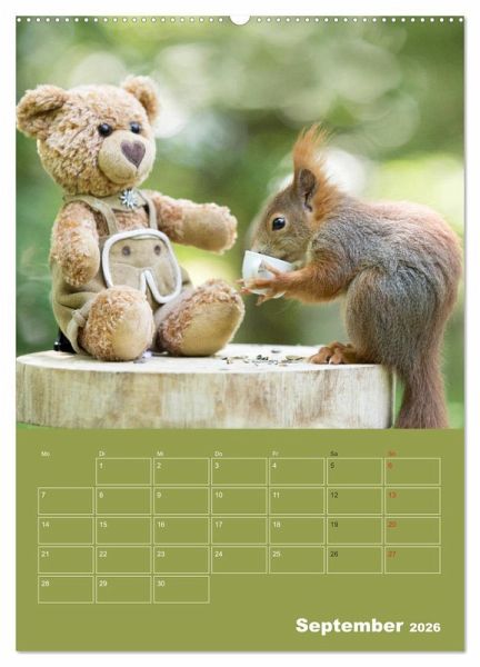 Eichhörnchen gehören zu den beliebtesten Wildtieren. Unsere einheimischen Eichhörnchen gibt es in verschiedenen Fellfarben die Sie im Kalender auch sehen können. Ihre Fellfarbe ist rot, braun, gemischte Farben oder aber auch ganz schwarz. Einen weißen Bauch haben alle unsere Eichhörnchen. Mit ihrer neugierigen, süßen Art verzaubern Sie uns immer wieder aufs Neue. Die Regensburger Eichhörnchen wissen schon, wenn Freund Teddy zu sehen ist, dann gibt es auch immer leckere Nüsse. Die süßen Outfits hat Rosita Roscher-Einsporn für Teddy angefertigt.