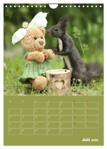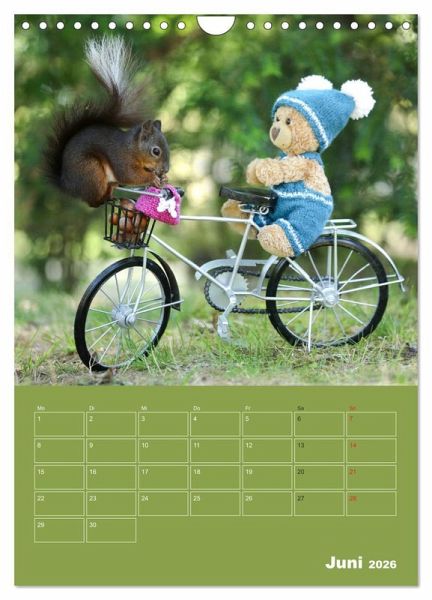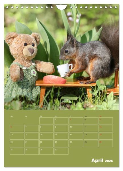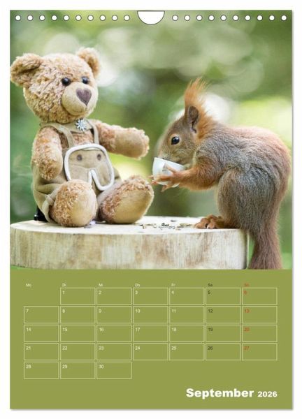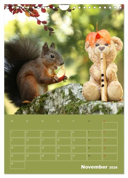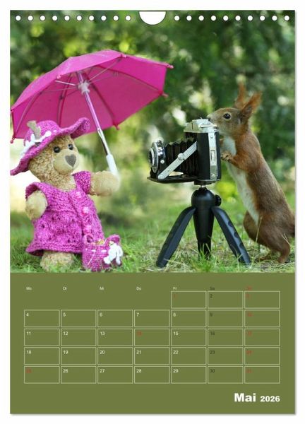 Eichhörnchen gehören zu den beliebtesten Wildtieren. Unsere einheimischen Eichhörnchen gibt es in verschiedenen Fellfarben die Sie im Kalender auch sehen können. Ihre Fellfarbe ist rot, braun, gemischte Farben oder aber auch ganz schwarz. Einen weißen Bauch haben alle unsere Eichhörnchen. Mit ihrer neugierigen, süßen Art verzaubern Sie uns immer wieder aufs Neue. Die Regensburger Eichhörnchen wissen schon, wenn Freund Teddy zu sehen ist, dann gibt es auch immer leckere Nüsse. Die süßen Outfits hat Rosita Roscher-Einsporn für Teddy angefertigt.