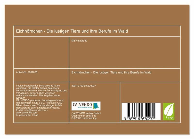 Dieser liebevoll gestaltete Tierkalender zeigt lustige Eichhörnchen in Berufen und bringt Wildtiere kindgerecht ins Kinderzimmer. Der Kinderkalender ist ideal für Kinder, die Tiere lieben, und eignet sich perfekt als Geschenk für Familien oder zur Dekoration im Kinderzimmer. Die charmanten Motive zeigen das beliebte Hörnchen als Förster, Gärtner oder Feuerwehrmann - humorvoll und kreativ in Szene gesetzt. Auch als Nager und Wald-Wildtier bekannt, ist das Eichhörnchen ein echter Liebling unter Kindern. Die Bilder mit KI generiert, verbinden hochwertige Optik mit originellen Ideen. Ein kreativer Tierkalender für Kinder, der spielerisch Neugier auf Wald und Natur weckt.