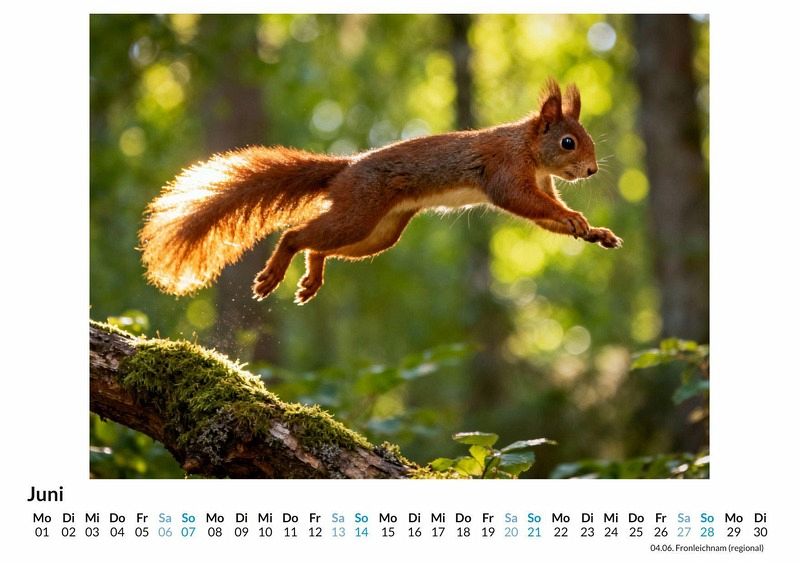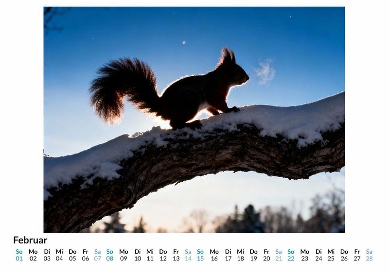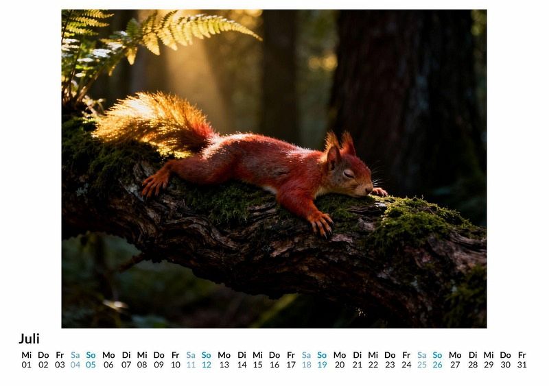 Flink huschen sie durch das Laub, klettern geschickt die Stämme empor und blicken neugierig in die Welt. Der Kalender "Eichhörnchen im Wald" fängt diese Momente ein und begleitet durch das Jahr. Er zeigt die kleinen Waldbewohner in den verschiedensten Facetten der vier Jahreszeiten, von der Futtersuche im Schnee bis zum Klettern in sonnendurchfluteten Baumkronen. Dieser Kalender ist eine gute Wahl: Für alle, die die Natur und ihre kleinen Bewohner schätzen. Für Liebhaber der agilen Nagetiere, die ihre Lebensfreude bewundern. Für Menschen, die einen unaufdringlichen und fröhlichen Wandschmuck für Zuhause oder das Büro suchen. Jedes Monatsblatt präsentiert eine Szene, die den Charakter der Jahreszeit widerspiegelt. Mal ist es ein Eichhörnchen, das im verschneiten Winterwald nach Nüssen sucht, mal eines, das im satten Grün des Sommers spielt. Jede Fotografie wurde durch die Zusammenarbeit von menschlicher Vision und digitaler Schöpfungskraft zum Leben erweckt und fängt die flinken Tiere in natürlichen Posen ein. Die Motive erzählen kleine Geschichten aus dem Waldalltag. Mit dem Kauf kann man Folgendes erwarten: Zwölf Monatsmotive mit Eichhörnchen in den Jahreszeiten. Ein übersichtliches Kalendarium für die Planung von Terminen. Ein Jahr voller charmanter Einblicke in das Leben der Waldtiere. Der Kalender "Eichhörnchen im Wald" ist eine Hommage an die kleinen, lebhaften Akrobaten unserer Wälder. Die Monatsansichten laden dazu ein, die kleinen Abenteuer der Eichhörnchen zu entdecken und sich jeden Monat aufs Neue von ihrer Energie anstecken zu lassen.