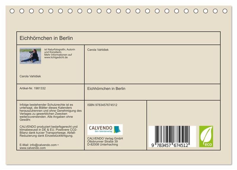 Die Naturfotografin, Autorin und Künstlerin Carola Vahldiek hat die putzigen Tiere in ihrem Lebensraum in Berlin mit Herz und Seele porträtiert. Entstanden sind zwölf herausragend schöne Eichhörnchen-Motive, die Eichhörnchen- und Tier-Freunde vor Glück aufseufzen lassen. Schenken Sie sich selbst oder Ihrer Familie und Ihren Freunden ein Jahr lang fröhliche Momente mit diesen großartigen Fotos.