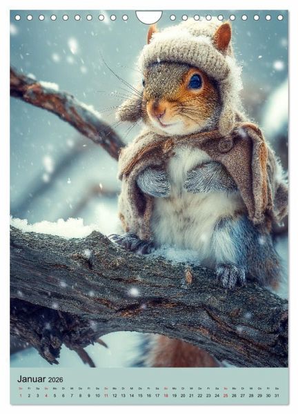 Abbildungen: Januar: Eichhörnchen mit Wintermantel im Schnee Februar: Eichhörnchen trägt graue Strickmütze März: Eichhörnchen mit Fellmütze Natur April: Eichhörnchen mit gelbem Regenhut Mai: Eichhörnchen trägt helle Mütze Juni: Eichhörnchen mit Sonnenbrille am Baum Juli: Eichhörnchen mit Schwimmreifen am