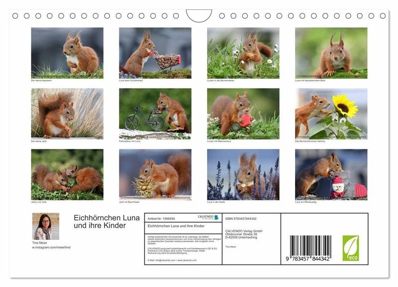 Über mehrere Jahre hat sich zwischen der Fotografin und dem Großstadt-Eichhörnchen Luna ein solch großes Vertrauen entwickelt, dass Luna regelmäßig ihrem Nachwuchs den Weg zu ihr zeigte. Mit viel Geduld und einer großen Leidenschaft für diese Wildtiere gelangen dabei einzigartig schöne Aufnahmen aus nächster Nähe. Die jungen Eichhörnchen suchten sich schließlich ein eigenes Revier, doch einige davon ließen sich zu einem späteren Zeitpunkt nochmals blicken. Dieser qualitativ hochwertige Kalender gehört zur exklusiven CALVENDO Gold-Edition.