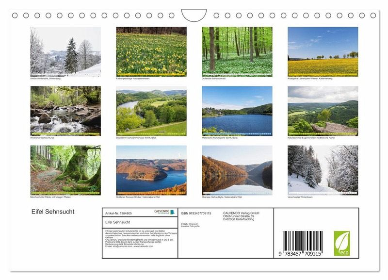 QUALITÄT - Hochwertiger Fotokalender mit 12 wunderschönen Motiven auf lichtbeständigem Bilderdruckpapier, robuste Spiralbindung mit Aufhängebügel.NACHHALTIG - deutliche Abfallreduzierung durch bedarfsgerechte Einzelstückfertigung, umweltfreundliches FSC-zertifiziertes Papier, Produktion in Deutschland, klimabewusste Logistik.PERFEKTES GESCHENK - Kalender für Freunde und Familie, für Kinder und Erwachsene, jung und alt, zu Weihnachten, Geburtstag oder zwischendurch.VIELFALT - Bildkalender in verschiedenen Formaten, z.B. DIN A5, DIN A4, DIN A3 sowie DIN A2. Ob Naturmotiv, Gemälde oder Fotos, ideal für ein persönliches Wohlfühlambiente.Traumhafte Nordeifel. von Autor(in): Gaby Wojciech