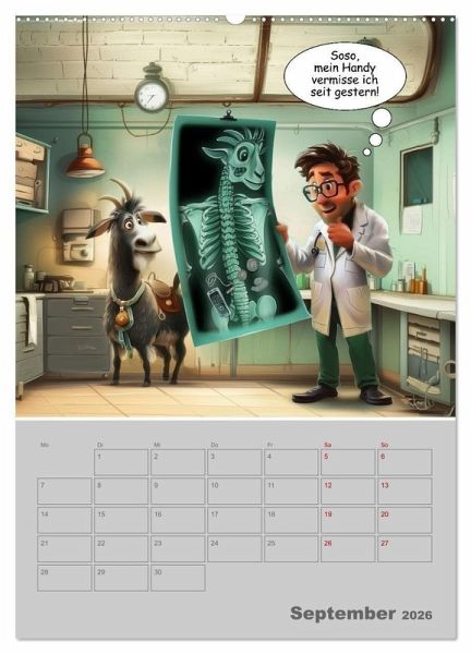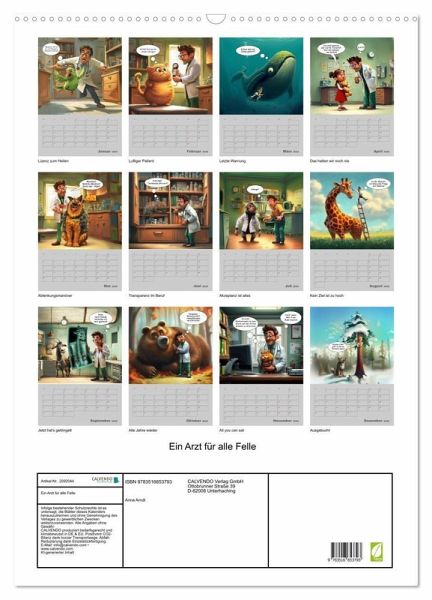 Der diesjährige Tierarzt-Kalender zeichnet sich durch charmante, humorvolle Cartoon-Motive aus, die in kreativer Zusammenarbeit einer deutschen Künstlerin und der künstlichen Intelligenz entstanden sind. Dieser Kalender fängt herzerwärmende und amüsante Momente zwischen dem Arzt und seinen tierischen Patienten ein. Ob für die Praxis, das Zuhause oder das Tierheim, er ist eine Quelle der Freude und Inspiration für Kinder und Erwachsene. Lassen Sie sich von den witzigen Begegnungen zwischen Mensch und Tier verzaubern und erleben Sie den Beruf des Tierarztes aus einer heiteren und zugleich liebevollen Perspektive. Der perfekte Begleiter für alle, die Humor und Tierliebe schätzen!