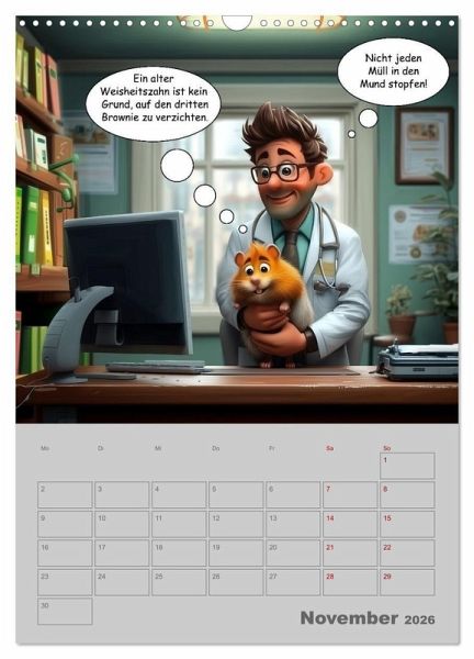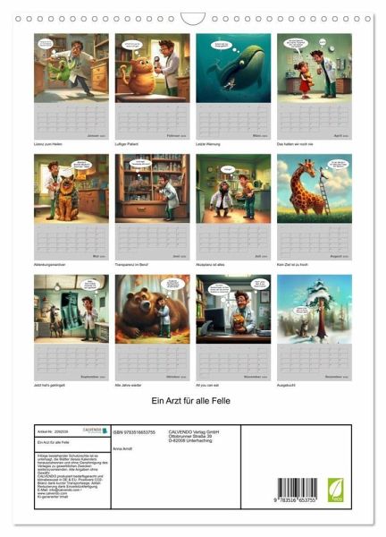 Der diesjährige Tierarzt-Kalender zeichnet sich durch charmante, humorvolle Cartoon-Motive aus, die in kreativer Zusammenarbeit einer deutschen Künstlerin und der künstlichen Intelligenz entstanden sind. Dieser Kalender fängt herzerwärmende und amüsante Momente zwischen dem Arzt und seinen tierischen Patienten ein. Ob für die Praxis, das Zuhause oder das Tierheim, er ist eine Quelle der Freude und Inspiration für Kinder und Erwachsene. Lassen Sie sich von den witzigen Begegnungen zwischen Mensch und Tier verzaubern und erleben Sie den Beruf des Tierarztes aus einer heiteren und zugleich liebevollen Perspektive. Der perfekte Begleiter für alle, die Humor und Tierliebe schätzen!