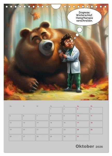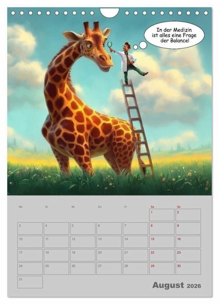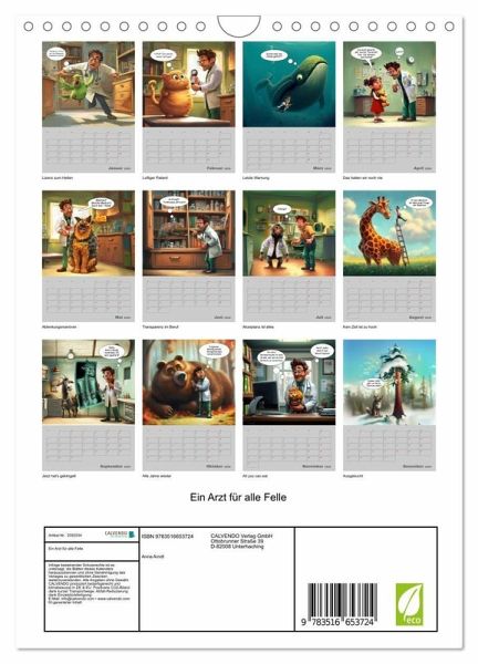 Der diesjährige Tierarzt-Kalender zeichnet sich durch charmante, humorvolle Cartoon-Motive aus, die in kreativer Zusammenarbeit einer deutschen Künstlerin und der künstlichen Intelligenz entstanden sind. Dieser Kalender fängt herzerwärmende und amüsante Momente zwischen dem Arzt und seinen tierischen Patienten ein. Ob für die Praxis, das Zuhause oder das Tierheim, er ist eine Quelle der Freude und Inspiration für Kinder und Erwachsene. Lassen Sie sich von den witzigen Begegnungen zwischen Mensch und Tier verzaubern und erleben Sie den Beruf des Tierarztes aus einer heiteren und zugleich liebevollen Perspektive. Der perfekte Begleiter für alle, die Humor und Tierliebe schätzen!