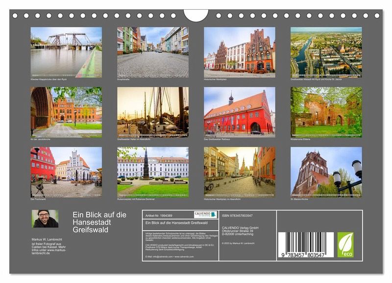 QUALITÄT - Hochwertiger Fotokalender mit 12 wunderschönen Motiven auf lichtbeständigem Bilderdruckpapier, robuste Spiralbindung mit Aufhängebügel.NACHHALTIG - deutliche Abfallreduzierung durch bedarfsgerechte Einzelstückfertigung, umweltfreundliches FSC-zertifiziertes Papier, Produktion in Deutschland, klimabewusste Logistik.PERFEKTES GESCHENK - Kalender für Freunde und Familie, für Kinder und Erwachsene, jung und alt, zu Weihnachten, Geburtstag oder zwischendurch.VIELFALT - Bildkalender in verschiedenen Formaten, z.B. DIN A5, DIN A4, DIN A3 sowie DIN A2. Ob Naturmotiv, Gemälde oder Fotos, ideal für ein persönliches Wohlfühlambiente.Greifswald - die romantische Hansestadt in Vorpommern. von Autor(in): Markus W. Lambrecht