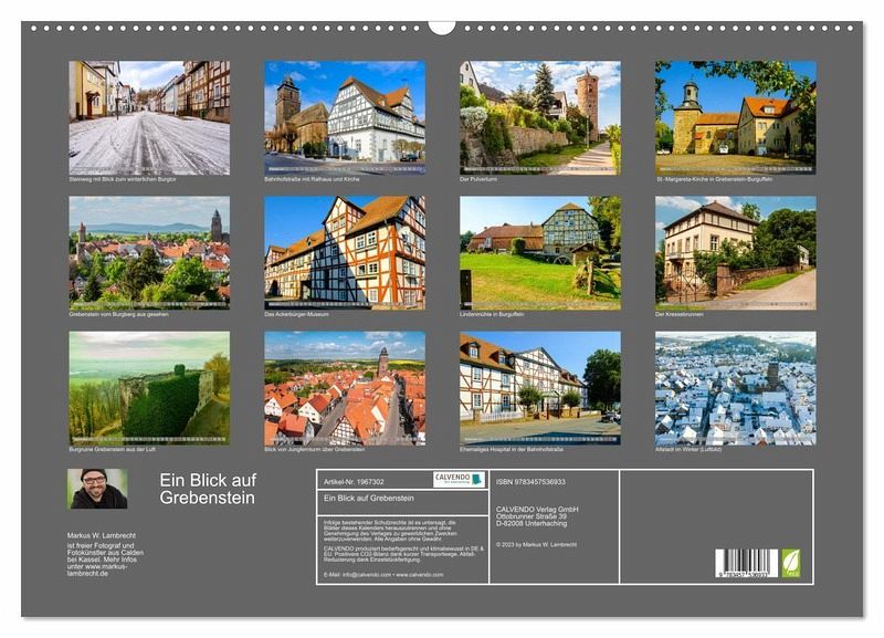 QUALITÄT - Hochwertiger Fotokalender mit 12 wunderschönen Motiven auf lichtbeständigem Bilderdruckpapier, robuste Spiralbindung mit Aufhängebügel.NACHHALTIG - deutliche Abfallreduzierung durch bedarfsgerechte Einzelstückfertigung, umweltfreundliches FSC-zertifiziertes Papier, Produktion in Deutschland, klimabewusste Logistik.PERFEKTES GESCHENK - Kalender für Freunde und Familie, für Kinder und Erwachsene, jung und alt, zu Weihnachten, Geburtstagoder zwischendurch.VIELFALT - Bildkalender in verschiedenen Formaten, z.B. DIN A5, DIN A4, DIN A3 sowie DIN A2. Ob Naturmotiv, Gemälde oder Fotos, ideal für ein persönliches Wohlfühlambiente.Grebenstein - Ackerbürgerstadt am Reinhardswald von Autor(in): Markus W. Lambrecht