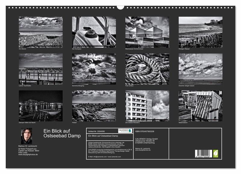 QUALITÄT - Hochwertiger Fotokalender mit 12 wunderschönen Motiven auf lichtbeständigem Bilderdruckpapier, robuste Spiralbindung mit Aufhängebügel.NACHHALTIG - deutliche Abfallreduzierung durch bedarfsgerechte Einzelstückfertigung, umweltfreundliches FSC-zertifiziertes Papier, Produktion in Deutschland, klimabewusste Logistik.PERFEKTES GESCHENK - Kalender für Freunde und Familie, für Kinder und Erwachsene, jung und alt, zu Weihnachten, Geburtstag oder zwischendurch.VIELFALT - Bildkalender in verschiedenen Formaten, z.B. DIN A5, DIN A4, DIN A3 sowie DIN A2. Ob Naturmotiv, Gemälde oder Fotos, ideal für ein persönliches Wohlfühlambiente.Ein ungewohnter Blick auf Damp an der Ostsee in harten Schwarz-Weiß-Bildern. von Autor(in): Markus W. Lambrecht