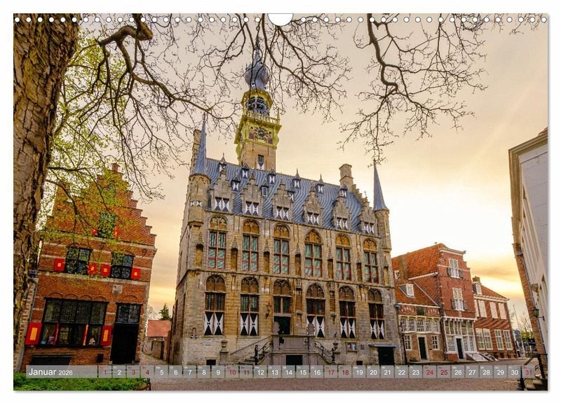 In der historischen Innenstadt von Veere finden sich auch heutzutage noch zahlreiche Häuser, Straßen und Gebäude, die aus dem 15. und 16. Jahrhundert stammen. Besuchen Sie das historische Stadhuis am Markt. Das Stadhuis und die Schotse Huizen (Schottischen Häuser) bilden gemeinsam das Museum Veere und geben Ihnen einen Einblick in die reiche Geschichte der Stadt. Unser Kalender nimmt Sie mit auf einen entspannenden Spaziergang durch diese schöne Altstadt am Veerse Meer.